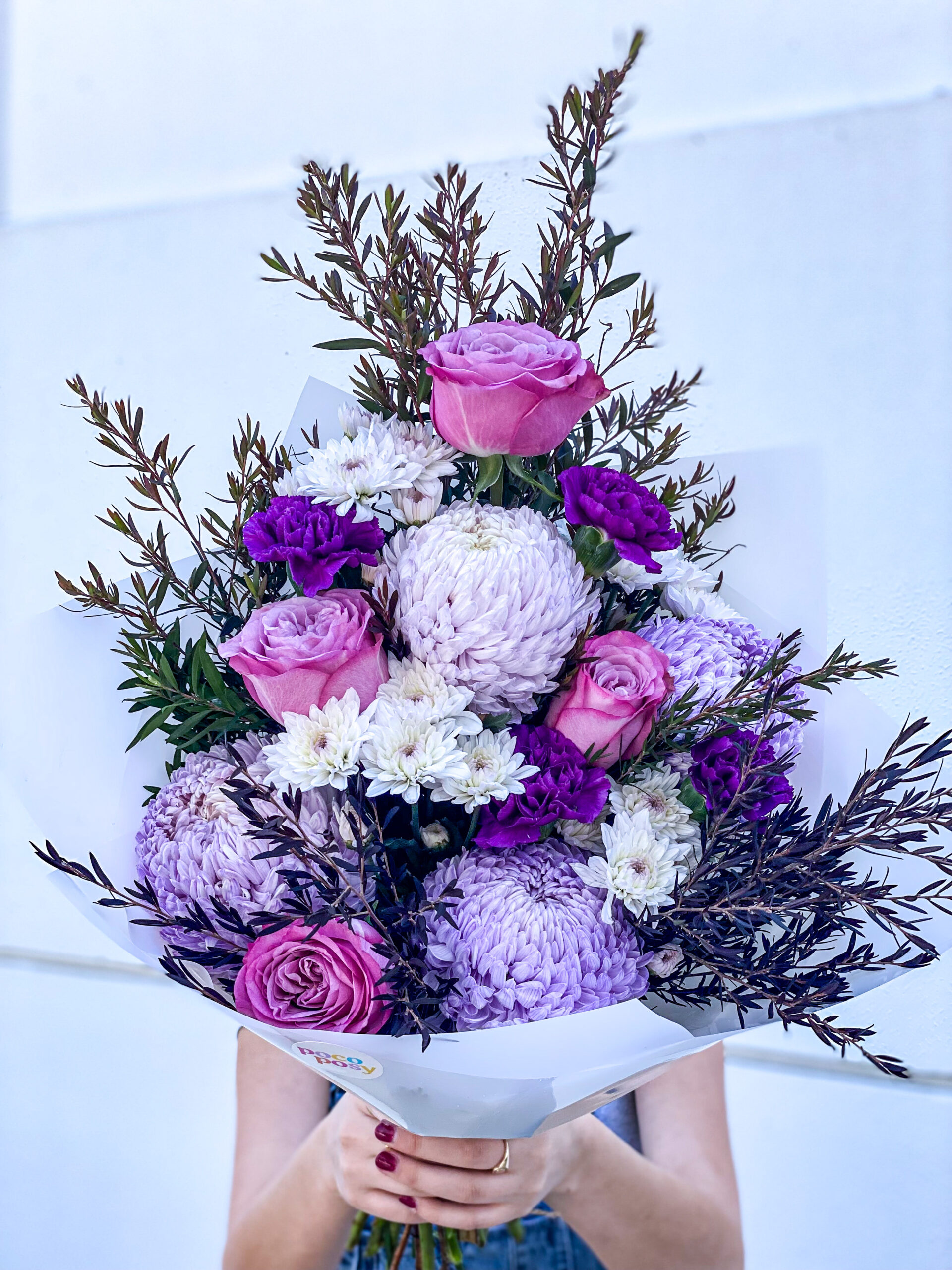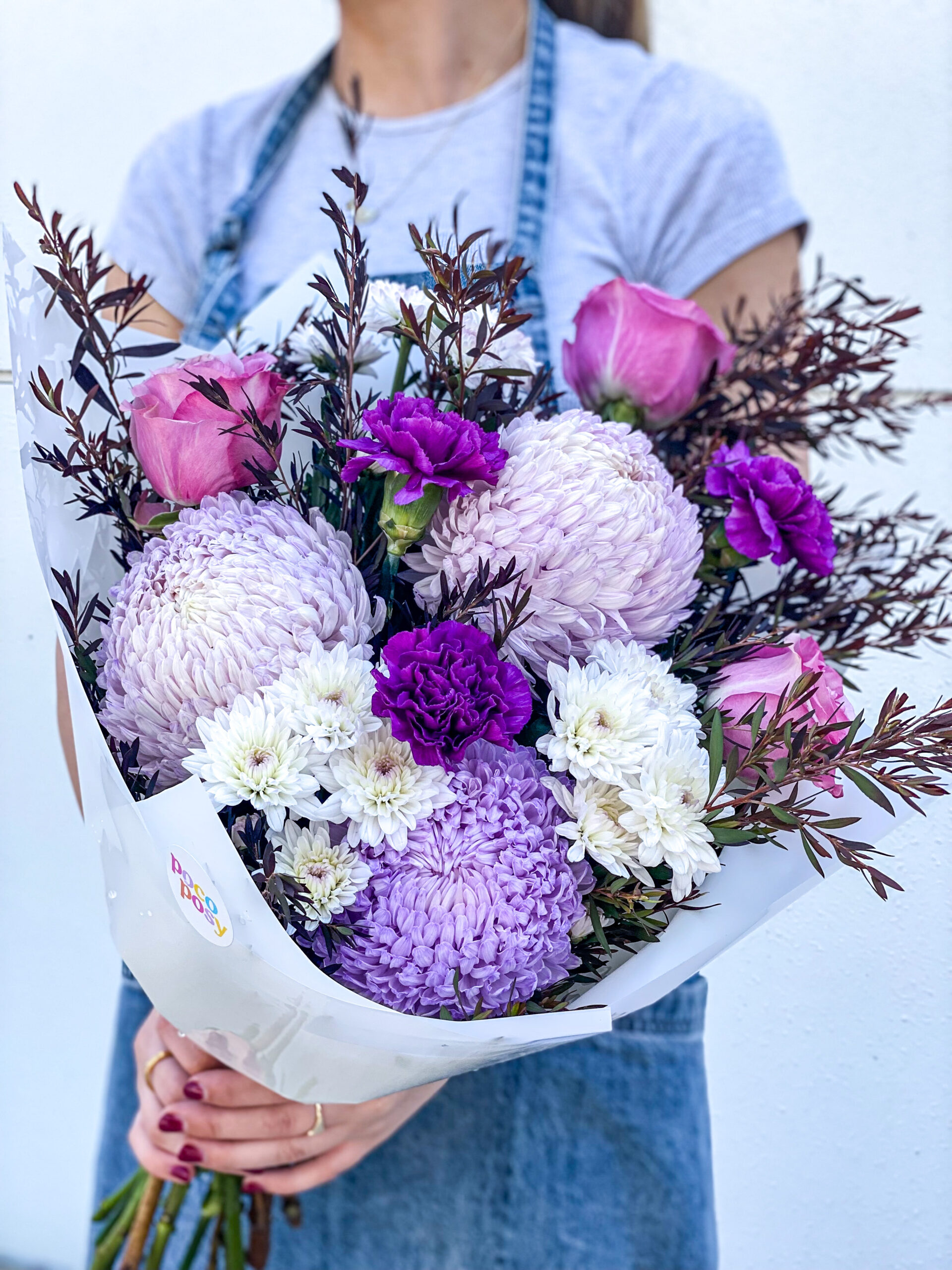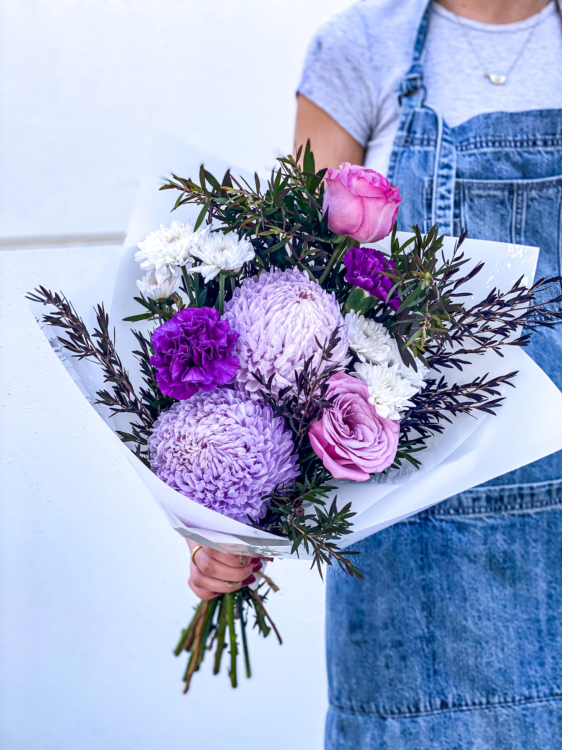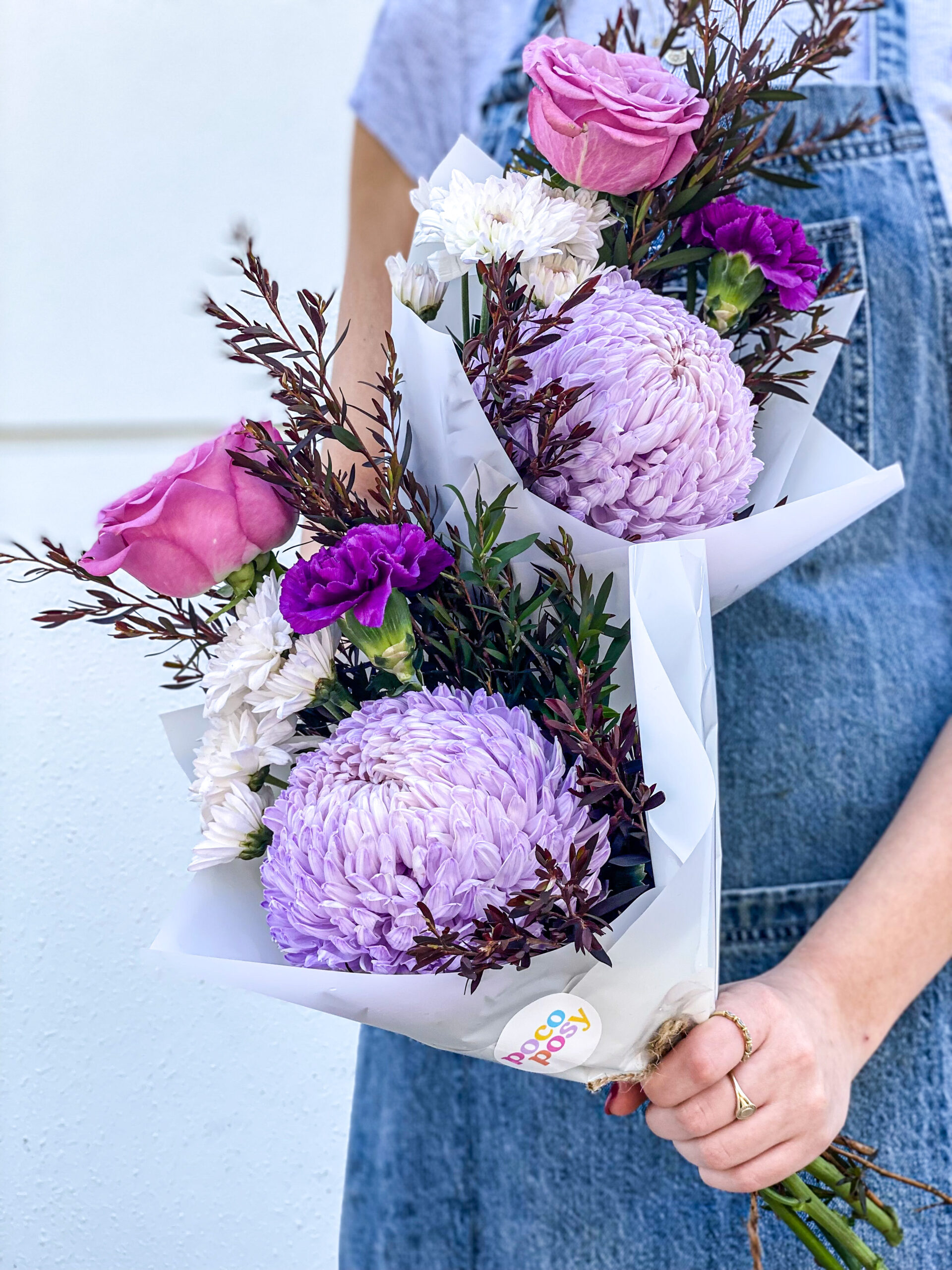 📸 Images shown are a general size & style guide only – each Purple Pop Posy is created fresh with the best seasonal blooms available on the day.