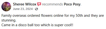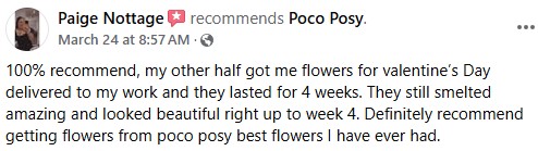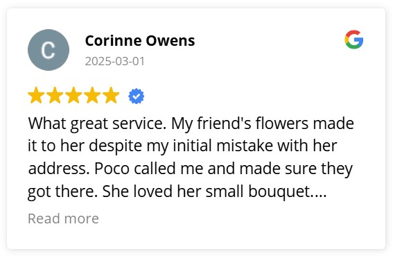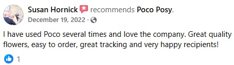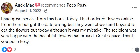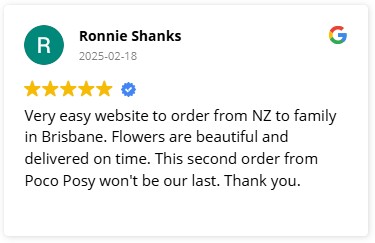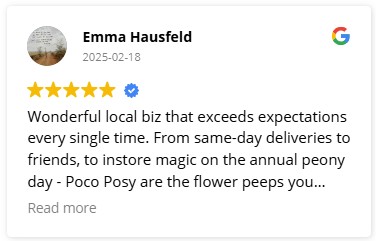 EXCELLENT Based on 357 reviews Posted on Ekaj AnatlusTrustindex verifies that the original source of the review is Google. Always great service. Been buying flowers for years here. Was able to deliver my order a day earlier when I had requested that same morningPosted on Martin Bjeldbak MadsenTrustindex verifies that the original source of the review is Google. Ordered my partner flowers from Poco Posy for the first time yesterday, and she absolutely loves them. It made her day. Thank you!Posted on Marcus GTrustindex verifies that the original source of the review is Google. Ordered some peonies for a special someone, and when they were delivered she was ecstatic. Perfect buds and colour. Service was quick and efficient. Will be using you guys again in the future. Thanks a million.Posted on Rosie BrooksTrustindex verifies that the original source of the review is Google. Super easy website to use to order flowers. I liked that it was so clear what a small/medium/large bunch was. Well priced and the recipients were very happy. Thanks so much.Posted on Lesley FTrustindex verifies that the original source of the review is Google. Always beautiful flowers . Delivered in a timely fashionPosted on Suzanne DoughtonTrustindex verifies that the original source of the review is Google. As a long time believer of "Say it with Flowers" & long time user (9 years actually)of, Poco Posy's Online Ordering availability, I navigated the Website & my double order with ease. Easy and accessible delivery route from start to finish, delivered fresh, in tack & exactly as described .. Thankyou yet again Poco Posy.. Happy & avid customer, Suzie D.... And, may I add, my Mothers Day Flowers my Family ordered from Poco Posy for me , roses, disbuds, carnations, magnolias, have lasted all this time until today... Thankyou!Posted on Y WTrustindex verifies that the original source of the review is Google. Sent me photos of the flowers when delivered to a friend. Absolutely beautiful and matched the pictures online. Very impressed! Would definitely order from them again.Posted on Carmel HobbinsTrustindex verifies that the original source of the review is Google. The recipients were very impressed and loved the flowers. Thank you, Poco PosyPosted on Julie AndersonTrustindex verifies that the original source of the review is Google. Another beautiful flower delivery to a friend. Poco Posy never fail to come through with beautiful flowers, reliable delivery and prices to suit every budget. Well done team 😊